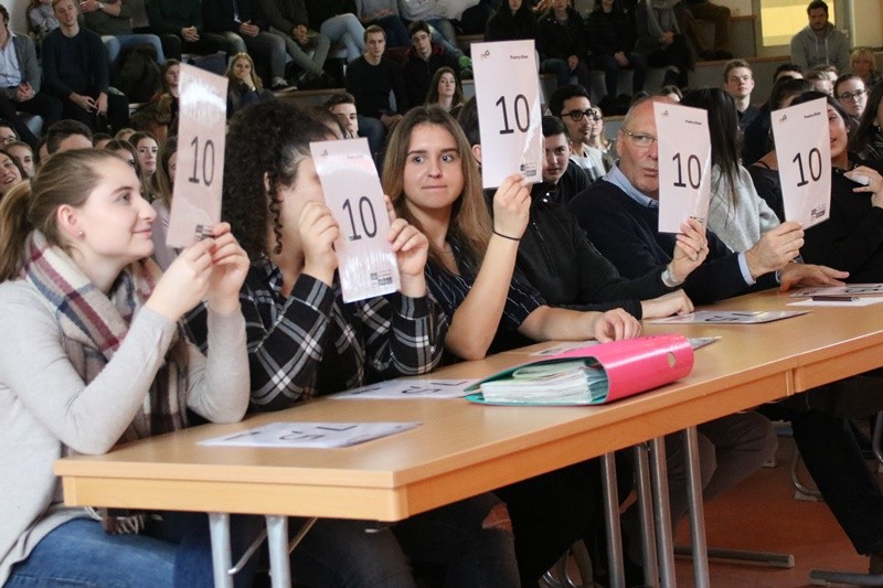 Doch auch wenn alle Kandidaten mit vielen Emotionen und einer ganz persönlichen Botschaft das Publikum begeisterten, musste die Jury, bestehend aus Herrn Pleiss, Frau Pauls, der Schülersprecherin Miriam Lischka, Fatma Akyildirim als Repräsentantin des SoR-Teams und Josefine Runge, einer Schülerin aus dem Publikum, jeden Einzelnen kritisch bewerten, denn nur die ersten drei Plätze erhielten Preise (20 €, 30 €, 70 €). Mit 46 von 50 möglichen Punkten belegte Merlin Leo Schäfer einen hervorragenden 3. Platz. Alexander Arenz, auch Klee genannt, aus dem 11 SK L1 belegte mit einem knappen Vorsprung von einem Punkt den zweiten Platz mit seiner emotionalen Rede darüber, dass die Ignoranz der Menschen dafür sorgt, dass man nicht zur Selbstliebe finden kann, weil man im Gefängnis des Selbsthasses gefangen bleibt, bis die Gesellschaft einen so akzeptiert, wie man ist.