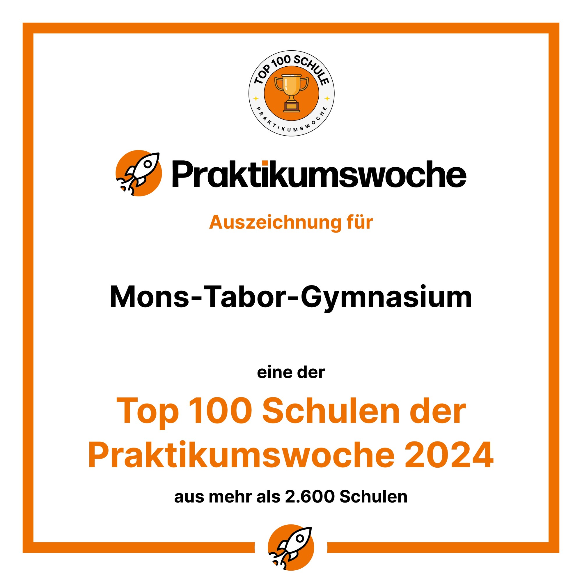 Die „Praktikumswoche“ hat die Top 100 Schulen der Aktion „Praktikumswoche 2024“ prämiert. Von über 2.600 Schulen deutschlandweit erhielten nur die Schulen diese Auszeichnung, an denen sich besonders viele Schülerinnen und Schüler an der Aktion beteiligt haben. In diesem Jahr kann sich auch unsere Schule über die Top 100 Auszeichnung freuen.