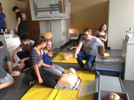 Dieses Mal wurden alle Schüler der 9. Klassen des Mons-Tabor-Gymnasiums am 20. und 21.6.2018 in den Basismaßnahmen der Wiederbelebung geschult. Das Projekt wurde initiiert und durchgeführt von Dr. med. G. Lopp, Fachärztin für Anästhesie, und D. Kentnowski, Fachpfleger für Anästhesie. Zuerst gab Dr. Lopp eine kurze Einführung zum Thema Kreislauf, Herzstillstand und Herzdruckmassage. Dann folgte die praktische Umsetzung. Mithilfe von Reanimationspuppen konnten alle anwesenden Schüler die Herzdruckmassage intensiv üben. Damit die Schüler konsequent mit der optimalen Frequenz von ca. 100-120 pro Minute drücken konnten, wurden während des Trainings bekannte und eingängige Pop-Songs eingespielt, die genau diesen Beat haben, so z.B. "Highway to Hell" oder "Staying Alive". Nach einer kurzen Anleitung zur Durchführung der Mund-zu-Mund-Beatmung wurde auch die Beatmung an den Trainingsmodellen geübt. Zum Abschluss wurde noch die Anwendung eines AEDs (automatischer externer Defibrillator) erklärt und mit Geräten, die von der Firma SMS medipool zur Verfügung gestellt wurden, trainiert. Die Resonanz der teilnehmenden Schüler und Lehrer war sehr positiv. Ausnahmslos alle waren mit großer Begeisterung dabei und die Schüler bemerkten schnell, dass Herzdruckmassage anstrengend ist. Frau Dr. Lopp erklärt: „Untersuchungen haben gezeigt, dass Schüler ab der 7. Klasse problemlos Erwachsene wiederbeleben können.“ Wichtig sei, Kindern und Jugendlichen schon in der Schule das Thema Reanimation näher zu bringen und sie frühzeitig als kompetente Ersthelfer auszubilden. „Jeder kann in die Situation geraten, Ersthelfer zu sein. Denn: Ein plötzlicher Herzstillstand kann jeden treffen“, betont die Ärztin. Das Projekt wurde finanziell unterstützt von der Volksbank Montabaur-Höhr-Grenzhausen (www.volksbank-montabaur.de), der MGS Meine-Gesundheit-Services GmbH (www.mgs-eportal.de), der AOK Rheinland-Pfalz/Saarland (rps.aok.de) und der evm (www.evm.de). Die organisatorischen Aufgaben wurden von Frau Weiß übernommen. Herzlichen Dank hierfür!