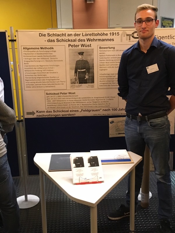 Zusammen mit einer Arbeit zu Feldpostbriefen aus dem Zweiten Weltkrieg und einer Analyse der Unabhängigkeitsbewegung Kataloniens gelang dies Julius mit seiner mikrohistorischen Untersuchung des Einzelschicksals eines Soldaten im Ersten Weltkrieg. In seiner Rede dankte Professor Busch (Didaktik der Gesellschaftswissenschaften) den teilnehmenden Schülerinnen und Schülern und betonte abschließend nocheinmal die hohe Qualität der Arbeiten der jungen Forscherinnen und Forscher.