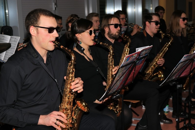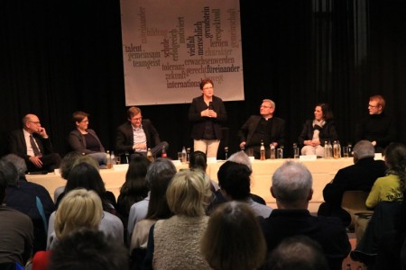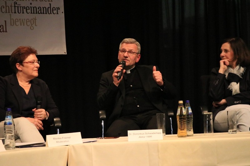 Dass die Gäste 40 Jahre Abitur repräsentierten und aus den unterschiedlichsten Berufen kamen, hatte einen besonderen Reiz, und daraus ergaben sich sehr interessante und auch unterhaltsame Beiträge. So wusste Dr. Hans-Joachim Höhn, Professor für Theologie aus der Schule von 1975 ebenso zu berichten wie von seiner Arbeit mit den Studentinnen und Studenten. Ein bleibender Eindruck aus seiner Schulzeit war, dass sein Jahrgang mit über 40 Kindern (in einer Klasse!) angefangen habe, von denen weniger als die Hälfte dann Abitur machten. Ganz nah an diesem Umfeld war der jüngste Teilnehmer, Carl Witzel der 2015 Abitur gemacht hat und nun an der Hochschule für Wirtschaft und Management (WHU) in Vallendar studiert. Ebenfalls an der WHU hat Dr. Matthias Winkenbach (Abi 2005) studiert. Er ist Direktor am Massachusetts Institut of Technology und untersucht Lösungen für Logistik-Probleme in Großstädten und - er ist für diesen Abend extra aus Boston „eingeflogen“. Mit Katharina Meder (Abi 2005), die über Skype aus Nairobi zugeschaltet wurde, ergab sich ein weiterer internationaler Kontakt. Bei ihrer wichtigen Arbeit für die GIZ (Gesellschaft für internationale Zusammenarbeit) betreut sie im Rahmen der Entwicklungshilfe Projekte in Kenia.Sicher ein ganz besonderer Gast dieses Abends war Dr. Dominikus Schwaderlapp, Weihbischof im Erzbistum Köln. Bei der Beschreibung seiner vielfältigen Aufgabenbereiche nennt er vor allem den Kontakt zu jungen Menschen, der ihm wichtig ist. Aus zwei ganz unterschiedlichen Bereichen konnten Deborah Schamuhn (Abi 2000) und Heike Röckelein-Wolf (Abi 1982) berichten. Frau Schamuhn hat als Musik-Moderatorin mit anspruchsvollen Sendungen beim SWR ihren Traumberuf gefunden. Mit der Tätigkeit von Frau Röckelein-Wolf erhielt man interessante Einblicke in ihre vielschichtige Arbeit als Abteilungsleiterin bei der Bundesbank in Frankfurt.Bei diesen sehr unterschiedlichen Lebenswegen und Berufen ergaben sich auf die Frage, welchen Einfluss das Mons-Tabor-Gymnasium auf diesen Weg hatte und was Schulen insgesamt für diese Entwicklung leisten sollten, sehr interessante Denkanstöße. Es wurde deutlich, dass die Zeit am MTG und die Anforderungen vor allem der Oberstufe in vielen Bereichen sehr gute Voraussetzungen geschaffen haben, an Universitäten und bei der Entwicklung beruflicher Qualifikation zu bestehen. Allgemein wichtig sei für die Entwicklung von Kindern und Jugendlichen unbedingt eine Lehrerpersönlichkeit, die Verständnis zeigt, die Interesse für Inhalte wecken kann, die auch durch besondere Fragen und Ausgaben zum Denken herausfordert. Die prägnante Formulierung „Keiner kann alles, keiner kann nichts“ brachte das auf den Punkt.Ein breites Allgemeinwissen, Sprachen, auch Erkenntnisse aus Fächern, für die man keine Vorliebe hat, wurden als Voraussetzung gesehen, damit man sich den vielfältigen Anforderungen einer globalisierten Welt stellen könne.Schule könne nicht auf alles vorbereiten, was zur Organisation des Alltags gehört, sie könne aber Strategien und Fähigkeiten vermitteln, diese Probleme eigenständig zu lösen. So hilfreich eine Unterstützung in Schule und Studium ist, so notwendig sei die eigene Initiative, sich Anforderungen zu stellen.Der Blick über Lerninhalte hinaus, indem man sich gesellschaftlich engagiert und Gemeinschaft mitgestaltet, wurde als wesentlicher Aspekt einer umfassenden Bildung gesehen.Der Blick auf die Big Band führte zu einem sehr passenden Fazit: Jeder arbeitet mit seinem Instrument, übt und erlangt Fertigkeiten. Aber erst im Zusammenspiel mit den anderen kann man sich beweisen und etwas Besonderes erreichen.Ein aufmerksames und gespanntes Publikum verfolgte mit Interesse die Gedanken, Empfehlungen und Eindrücke der Gesprächsrunde. Ein besonderes Highlight stellten die beschwingten musikalischen Beiträge der Big Band dar, die Dirigent Elmar Wehmeyer für diesen Abend aus ehemaligen Mitgliedern zusammengestellt hatte. Vielen Dank dafür!!Dieser besondere Abend hatte, wie auch unser Schulleiter Armin Pleiss betonte, durch die anspruchsvollen Beiträge der Gäste einen besonderen Stellenwert im Rahmen des Festprogramms. Er freute sich, dass Monika Friemel, ehemalige Lehrerin am MTG, Moderatorin der Runde war und souverän durch den Abend führte und dankte abschließend allen Mitwirkenden.
