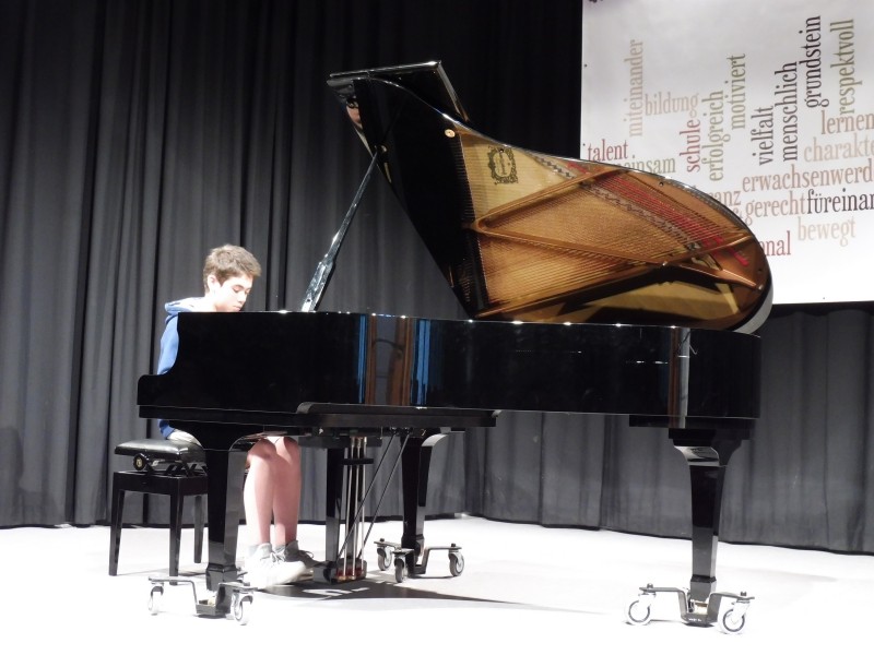 Anschließend verzauberte Vincent Rehbein (7b), dem Publikum schon als Sieger des Monsta-Music-Awards bekannt, die Zuhörer am Flügel mit einem selbst komponierten Stück.