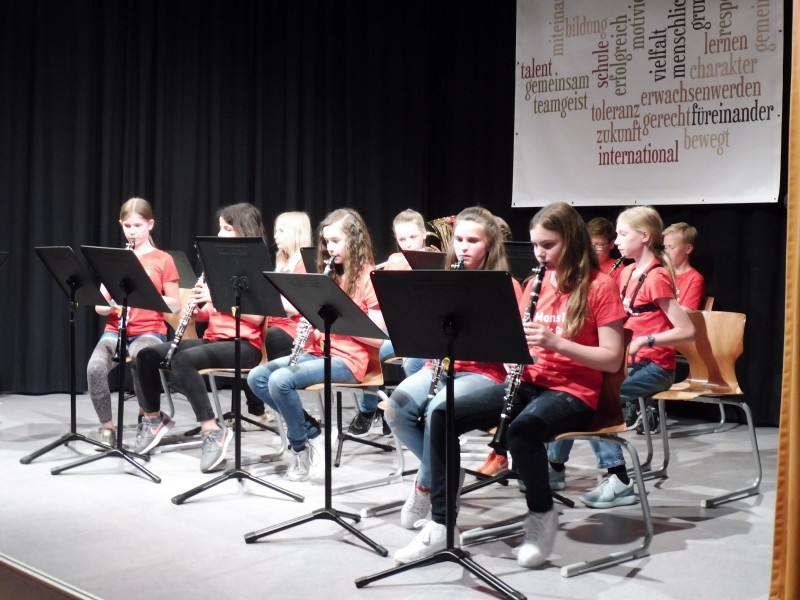 Dann wurde es wieder voll auf der Bühne: die monsTa-music-gang betrat die Bühne. Unter der Leitung von Herrn Wehmeyer präsentierten sie drei Stücke und zeigten, wie sie nach nun fast zwei Jahren Bläserklasse ihre Instrumente beherrschen.