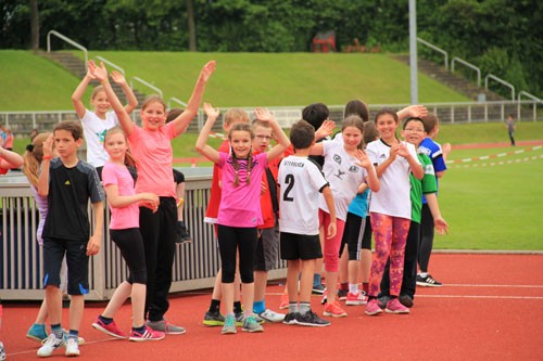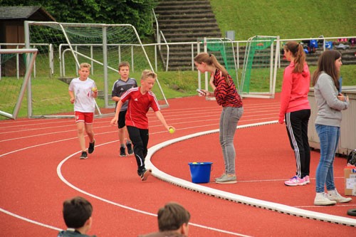 Das Sportfest der Mittel (7+8) - und Unterstufe verlief dieses Mal in einem neuen Modus: Während die Klassen 5 und 6 im Stadion den "üblichen" Disziplinen Sprint, Sprung und Wurf sowie parallel und am Ende der Einzelwettkämpfe ein Klassen-8-Minutenlauf sowie zwei Klassen-Pendelstaffeln absolvierten, fanden in den beiden Hallen die Spielewettkämpfe der Klassen 7 und 8 in Handball, Fußball und Basketball statt.