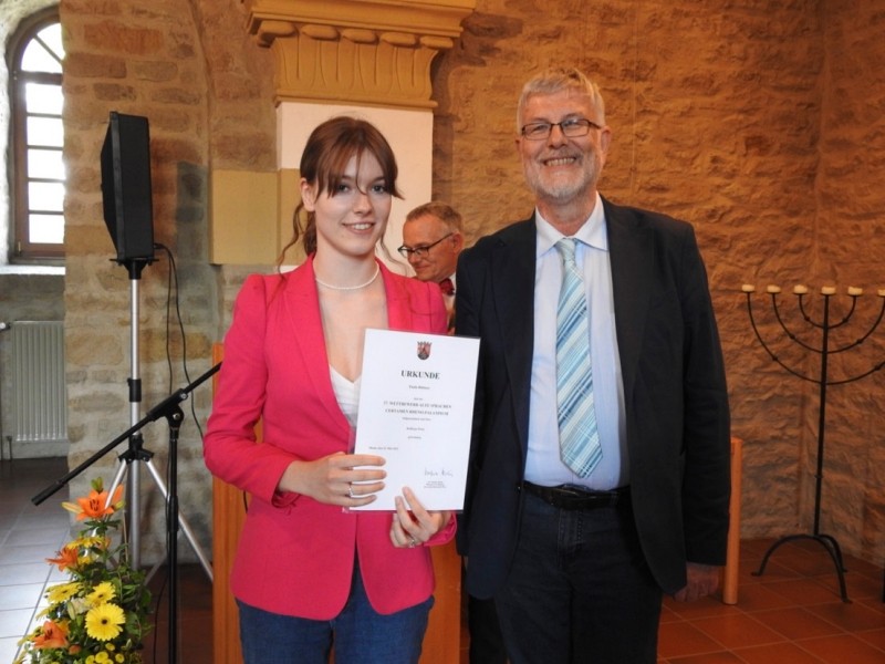 Auch diese Arbeit überzeugte die Jury außerordentlich, sodass Paula, inzwischen Abiturientin unserer Schule, im Juni diesen Jahres zur Preisverleihung nach Meisenheim eingeladen wurde. Dort wurde Paula für ihre Hausarbeit mit dem Kalliope-Preis ausgezeichnet und durfte sich zusätzlich über den Einzug in die dritte und letzte Stufe des Wettbewerbs freuen, welche in Form eines Kolloquiums an der Universität Mainz durchgeführt wird.
