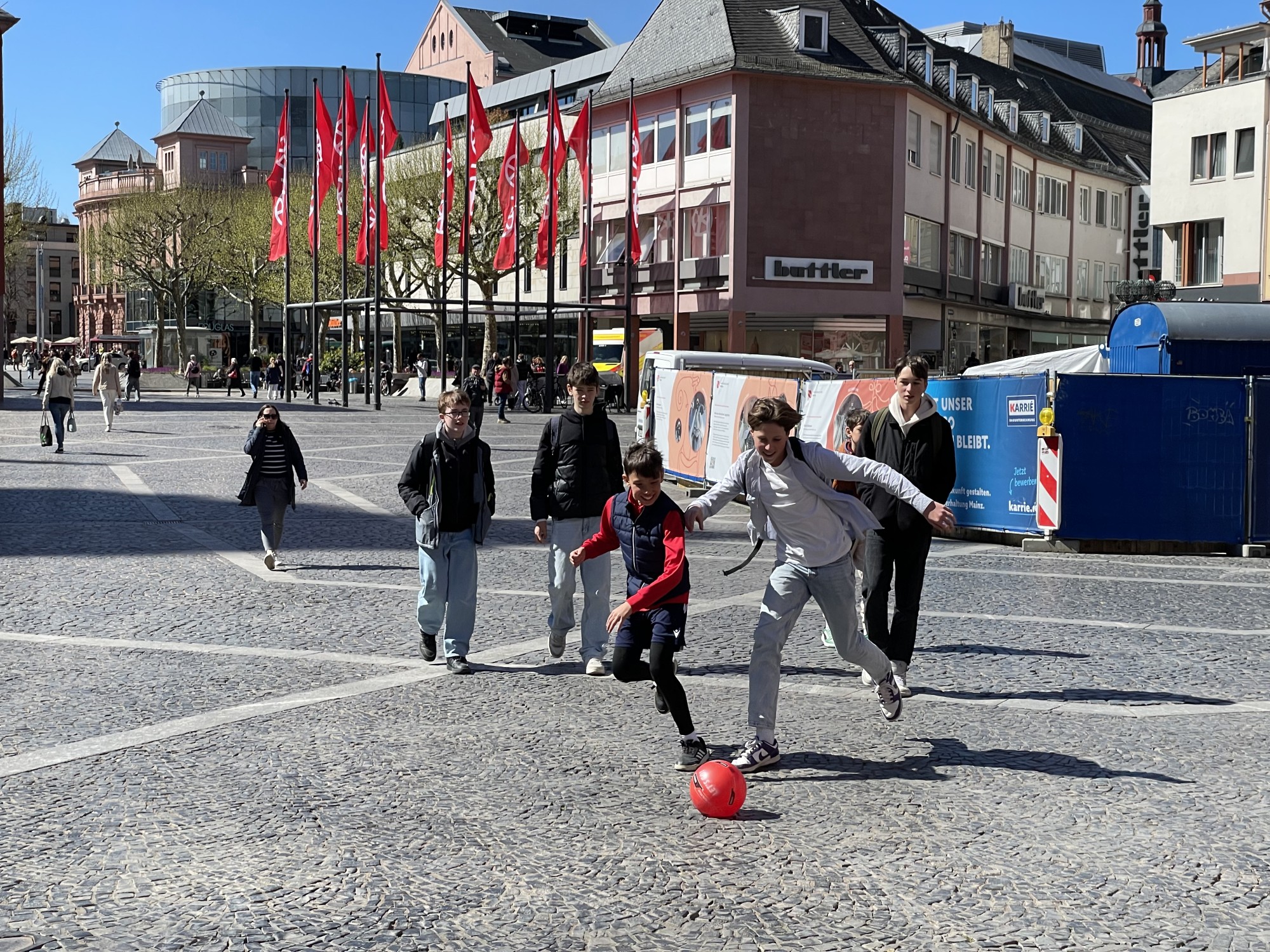 In Mainz angekommen, starteten wir eine Rallye in Kleingruppen. Dabei sollten wir verschiedene Fragen zur Stadt beantworten. Mit Hilfe der Touristeninformation und Google Maps fanden wir uns gut zurecht und lernten viel über Mainz und seine Sehenswürdigkeiten. Auch ein Besuch des Doms durfte natürlich nicht fehlen. Die restliche Zeit verbrachten wir gemeinsam mit anderen Teams in der Sonne, mit reichlich Snacks – und einem kleinen Shoppingausflug, der besonders bei den französischen Gästen gut ankam.