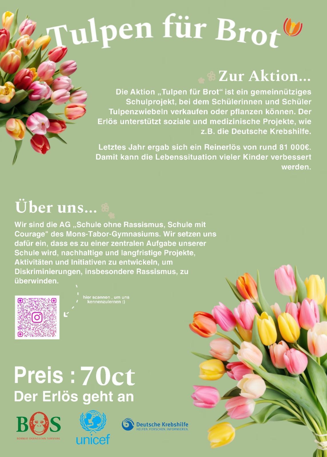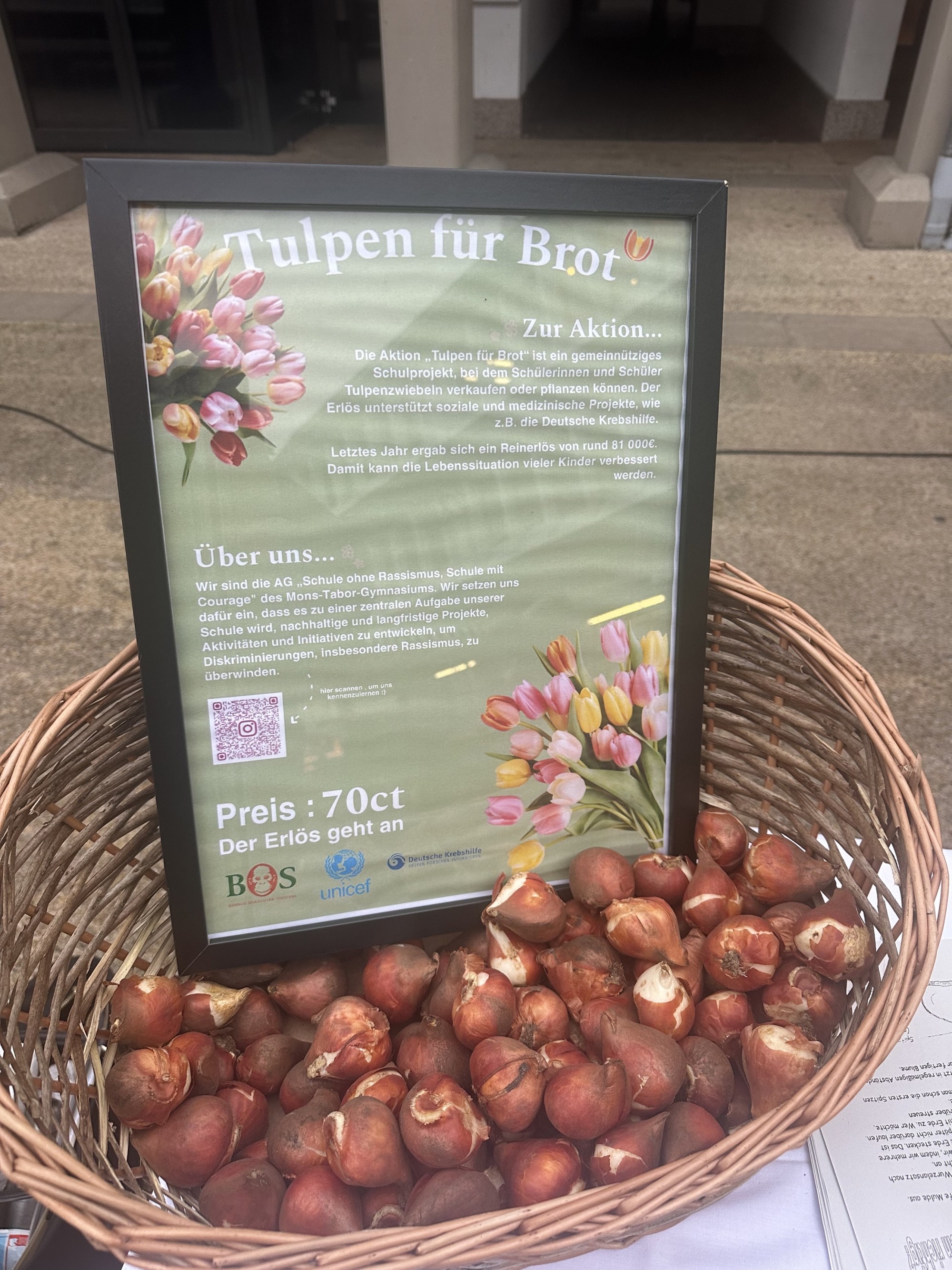 Die Aktion ‚Tulpen für Brot‘ ist ein gemeinnütziges Schulprojekt, bei dem Schülerinnen und Schüler Tulpenzwiebeln verkaufen oder pflanzen können. Der Erlös geht zu 45% an BOS (Borneo Orang-Utan Survival Foundation) zu 45 % an UNICEF und zu 10% an die Deutsche Krebshilfe.
