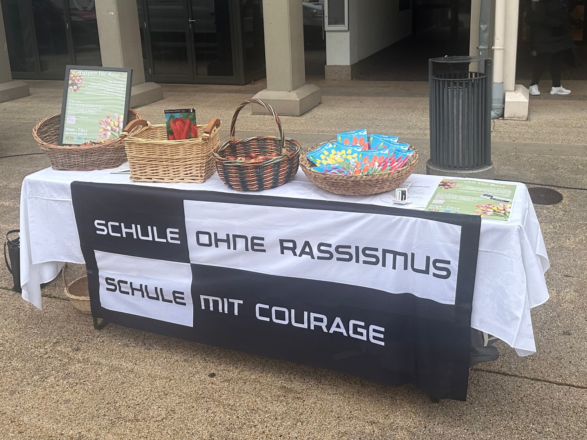 Schülerinnen der „Schule ohne Rassismus – Schule mit Courage“ AG nahmen dieses Jahr an der Aktion „Tulpen für Brot“ teil, verkauften über 500 Tulpenzwiebeln und sammelten somit rund 400 Euro für den guten Zweck.
