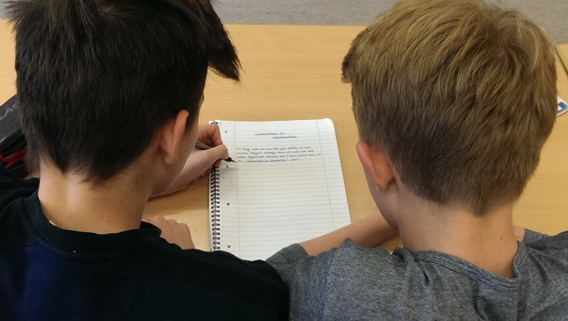In der Klassenstufe 9 beschäftigten sich die Schülerinnen und Schüler im Rahmen der Reihe „Mensch als Ebenbild Gottes – Gerechtigkeit und Menschenwürde“ damit, wie sie sich konkret und im Kleinen für mehr Gerechtigkeit und Achtung der Menschenwürde einsetzen können. Die drei besten Ergebnisse wurden demokratisch gewählt. Das Photo zeigt Adrian und Till, die auch einen Beitrag geliefert haben. (Franziska Nimmler mit Schülerinnen und Schülern der 9a, 9b, 9c, 9d und 9e)