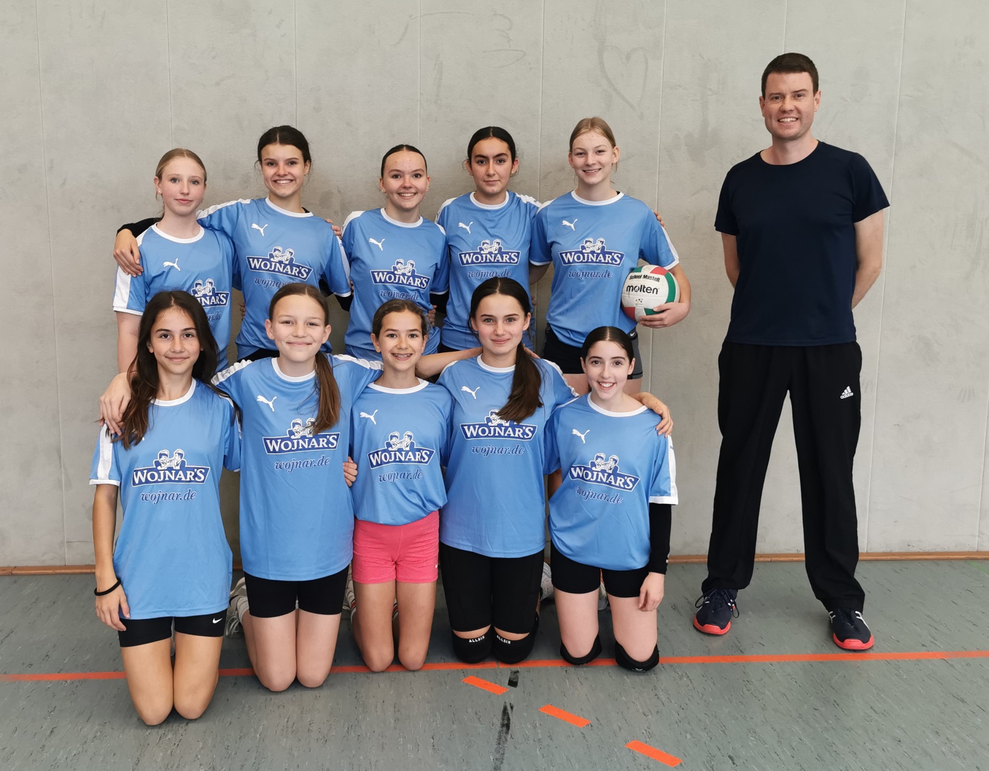 Mannschaftsfoto: (Hinten von links) Clara Metternich, Emma Quetlich, Edda Hausmann, Ena Altun, Mascha Rüb, Herr Zozmann (Coach). (Vorne von links) Stina Krapi, Hannah Lepper, Juna Bäcker, Katharina Eichwald, Azra Gedik.