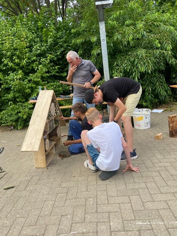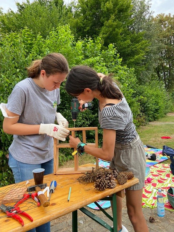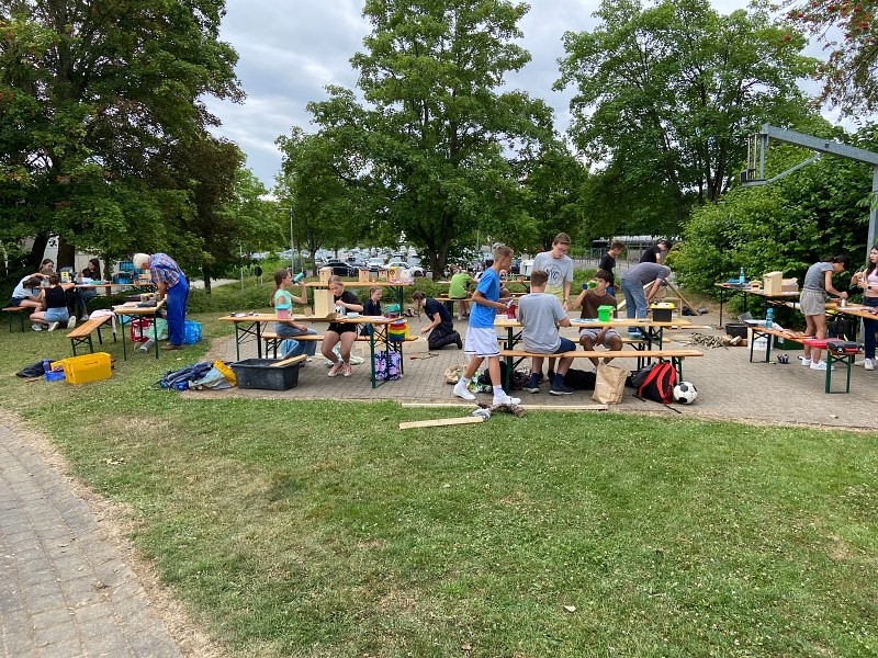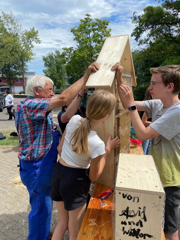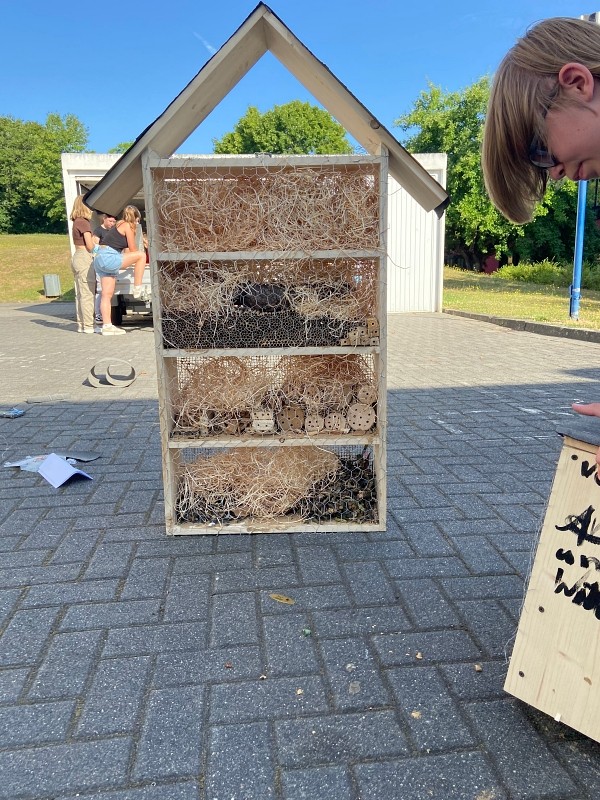 Die Schülerinnen und Schüler der Klasse 7b des Mons-Tabor-Gymnasiums Montabaur hatten sich zum Abschluss ihres erfolgreichen Schuljahres gewünscht, im Deutschunterricht gemeinsam etwas in Kleingruppen zu erarbeiten.Da das Buch hierzu das Thema „Umweltschutz“ vorschlägt, war der Grundstein für die folgenden Wochen gelegt. Von den zu Anfang geplanten Plakaten und Minipräsentationen wichen die Kinder schnell ab und erstellten Videos, Podcasts und Flyer rund um das Thema „Umweltschutz“, welche zum Teil bei den „Geografischen Tagen“ im Juni eingesetzt wurden und mit Arbeiten aus deutlich höheren Klassen mithalten konnten. Nachdem eine Gruppe auf die Idee kam, Geld für einen eigenen Schulbaum zu sammeln, nahm das Großprojekt seinen weiteren Lauf. Denn was machen mit dem Restgeld? Wer hilft beim Backen? Woher bekommt man weitere Spenden? Welcher Baum erfüllt alle Anforderungen an ein Leben auf dem Schulhof?Viele dieser Fragen lösten die Kinder, indem sie selbstständig in Baumschulen anriefen, mit Lehrern, Hausmeistern und wissenden Eltern sprachen, im Internet recherchierten und einen Kuchenverkauf planten und durchführten. Erste Spenden wurden im Lehrerzimmer mit einer Spardose gesammelt, die ein Schüler aus einem Nandu-Ei aus dem großelterlichen (Tier-)Garten anfertigte.Beim anschließenden Kuchenverkauf wurden die Kinder durch ihre Parallelklasse 7c beim Backen unterstützt und so kamen letztendlich knapp 50 Kuchen, teils glutenfrei, zum Verkauf. Dank einem weiteren mobilen Verkauf auf dem Schulhof, einem Miniverkaufsstand vor dem Lehrerzimmer und kleiner Geldspenden kamen rund 450 Euro in die Kasse der Kinder. Schnell war klar: Mit dem restlichen Geld soll ein Insektenhotel angeschafft werden. Doch warum kaufen, wenn man auch selbst eins bauen kann? Und wenn man den Insekten was Gutes tut, warum dann nicht auch den Vögeln?Um die Schulgemeinschaft, Schulleitung, Hausmeister, Zeitung und weitere Stellen über alles zu informieren, planten und schrieben die Kinder offizielle Briefe an alle Beteiligte und übten sich somit auch in dieser formalen Textsorte. So stand die Klasse letztendlich zwei Wochen vor den Sommerferien bereit, um an einem Projekttag mehrere Insektenhotels und Nistkästen zu bauen, für die sie das Material und die Werkzeuge größtenteils aus den (groß-)elterlichen Vorräten organisierten. Die Pausen wurden genutzt, um ein bestehendes Außenklassenzimmer vom Unkraut zu befreien, welches im neuen Schuljahr wieder zum Einsatz kommen soll. Beim Bau wurden die Kinder durch Großeltern, Eltern und Freunde unterstützt. Eine überraschende Getränke- und Eislieferung versüßte den Kindern den warmen und anstrengenden Tag. Am Ende des Projekttages waren fünf Insekten- und Bienenhotels und 14 Nistkästen fertig zusammengeschraubt und dank der Achtsamkeit der Kinder gingen keine Finger und Werkzeuge verloren.Zwei Tage vor den Sommerferien wurden die Nistkästen aufgehängt und die Insektenhotels werden spätestens nach den Ferien aufgestellt und im Boden verankert. Dank der Unermüdlichkeit der Kinder und Kontakte zu engagierten Eltern werden im Herbst gleich zwei Linden an das Mons-Tabor-Gymnasium geliefert und mit der Hilfe von Herrn Schuhbäck gepflanzt. Derzeit arbeitet die Klasse unter Leitung ihrer Deutschlehrerin Nicole Etzkorn an einer Plakatausstellung für das kommende Schuljahr, welche über seltene und gefährdete Insektenarten im heimischen Garten informieren soll. Eine Gruppe übersetzt ihr Plakat ins Ukrainische… es bleibt spannend, was den Kindern im neuen Schuljahr alles einfallen wird!Die Aussichten zeigen, dass dank vieler engagierten Kurse, Klassen und Kolleginnen und Kollegen der Schulgarten des Mons-Tabor-Gymnasiums wieder aufleben wird. Weitere tolle Aktionen und Berichte werden daher folgen.