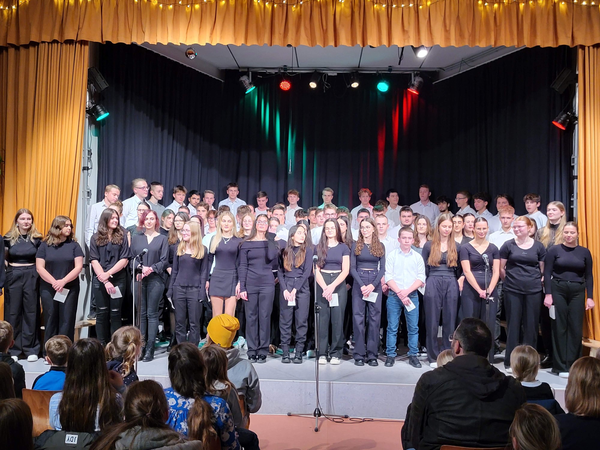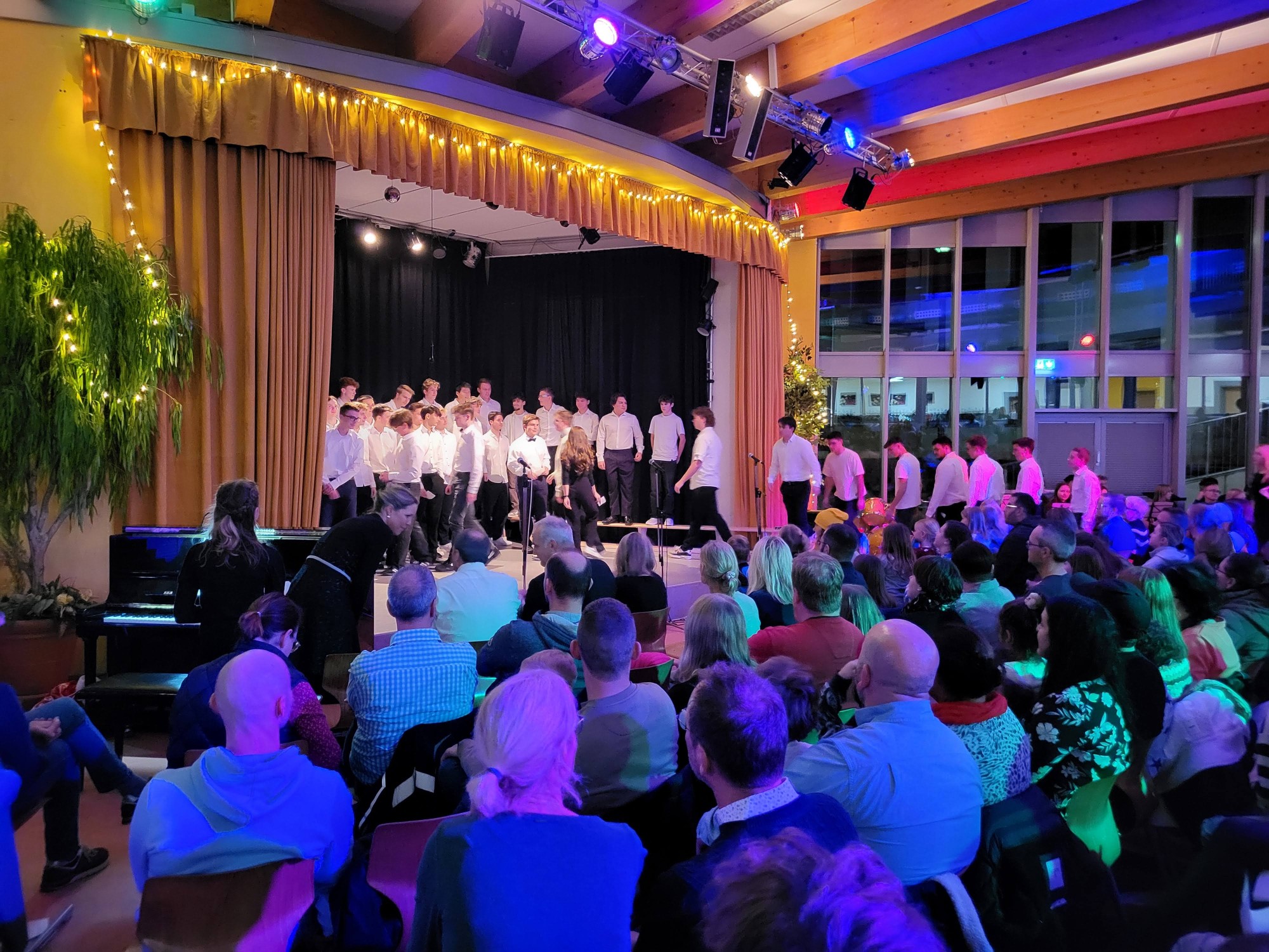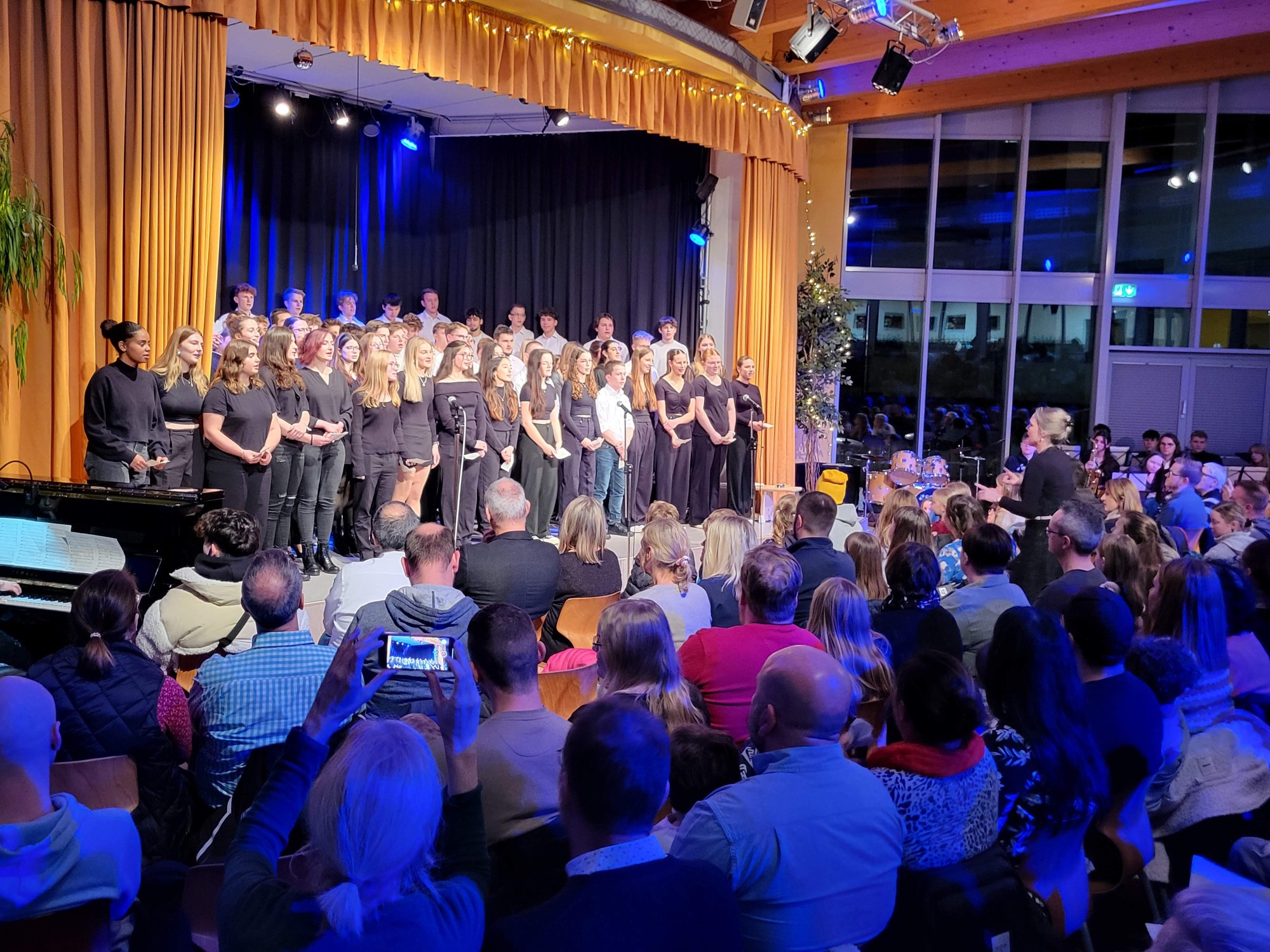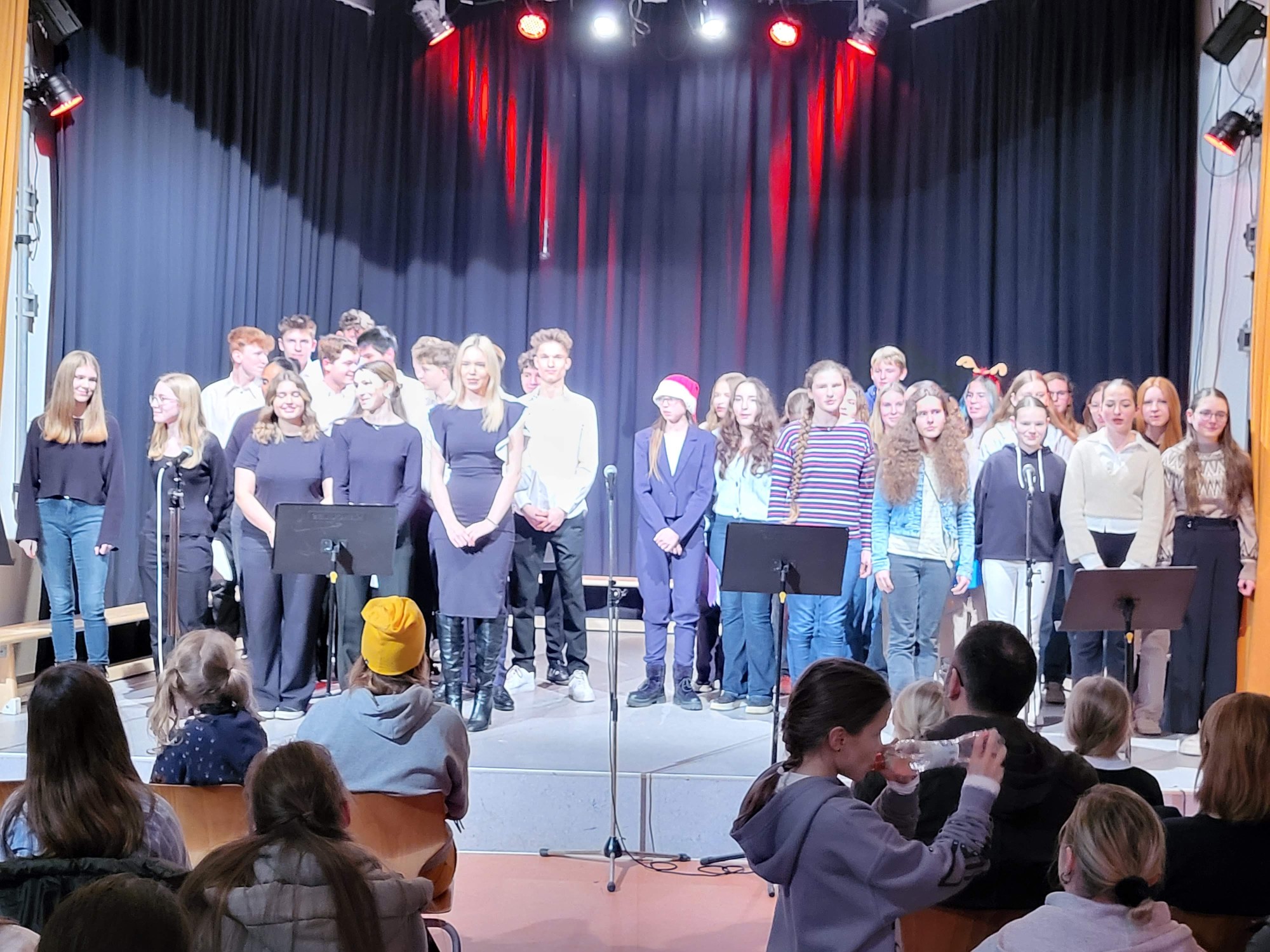 Als vorletzten Programmpunkt präsentierte sich die Klasse 10e, unter Leitung von Frau Fayzi, und trug verschiedene Weihnachtslieder toll vor. Den Abschluss des Programmes bildete der Oberstufenchor, der sich nun mit drei weihnachtlichen Stücken präsentierte, u.a. mit dem Klassiker „Last christmas“. Mit einem zweistimmigen „Silent night“ endete der offizielle Teil des Konzertes und das traditionelle Lied „O du Fröhliche“ wurde zum Abschluss mit allen, begleitet von der Big Band, gesungen. Passend zu dem tollen Programm moderierten Linus Heinemann und Maxim Chetchouga (beide MSS 13) lebhaft und unterhaltsam durch den Abend. Es war ein rundum schönes Konzerterlebnis, das mit den Dankesworten des Schulleiters an die ausführenden Schülerinnen und Schüler und die Musiklehrer/innen herzlich beendet wurde.