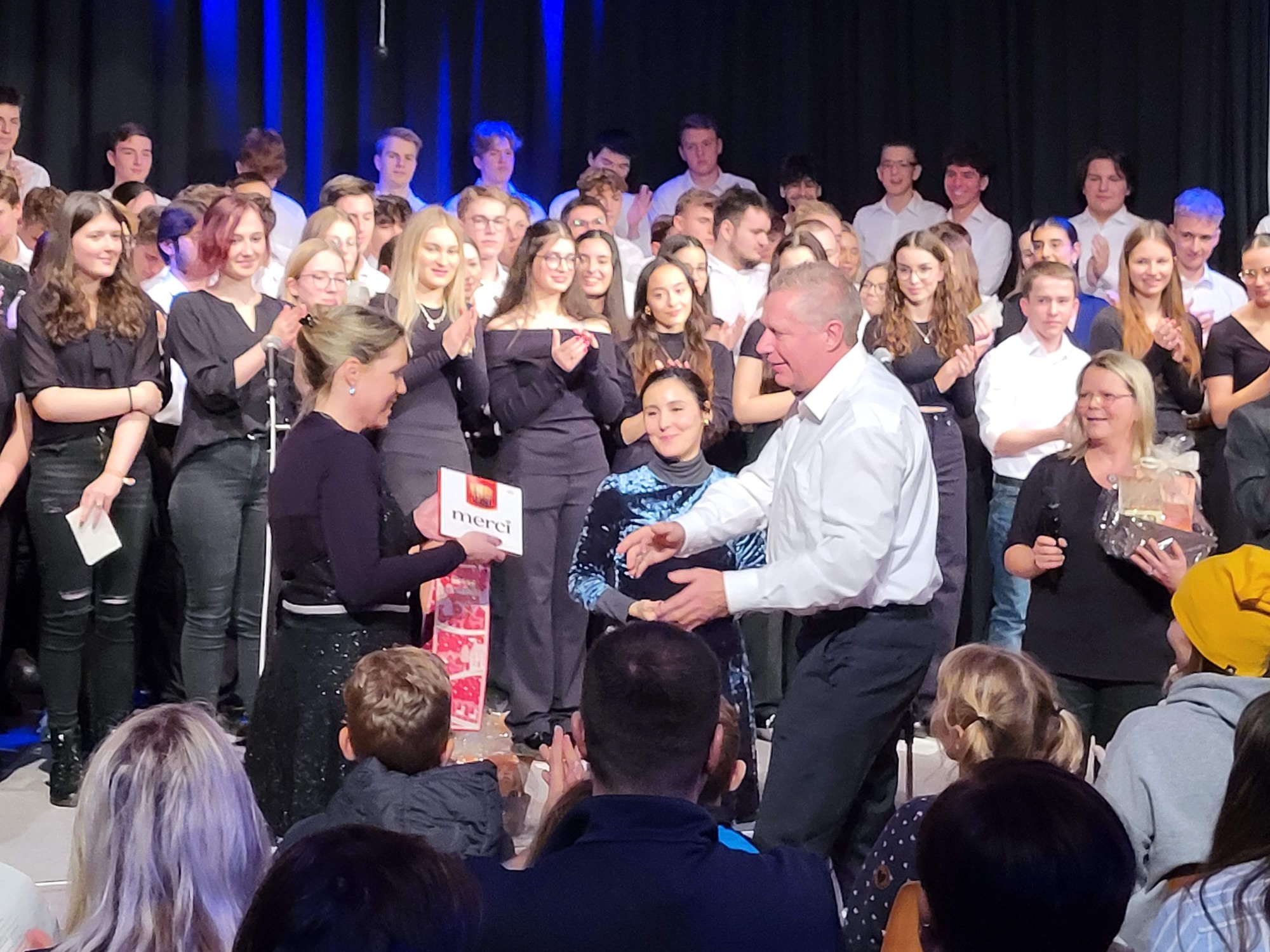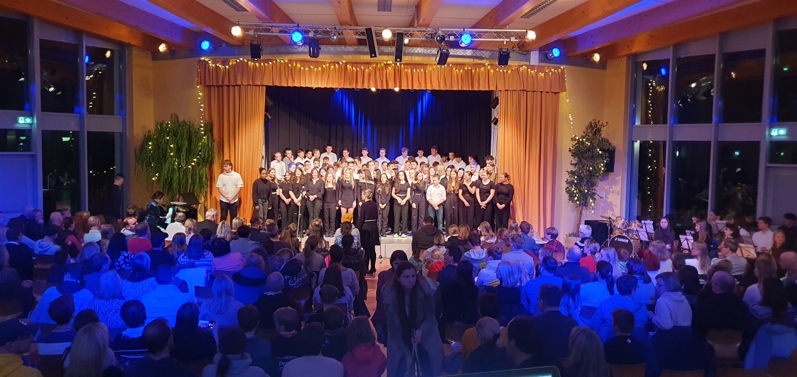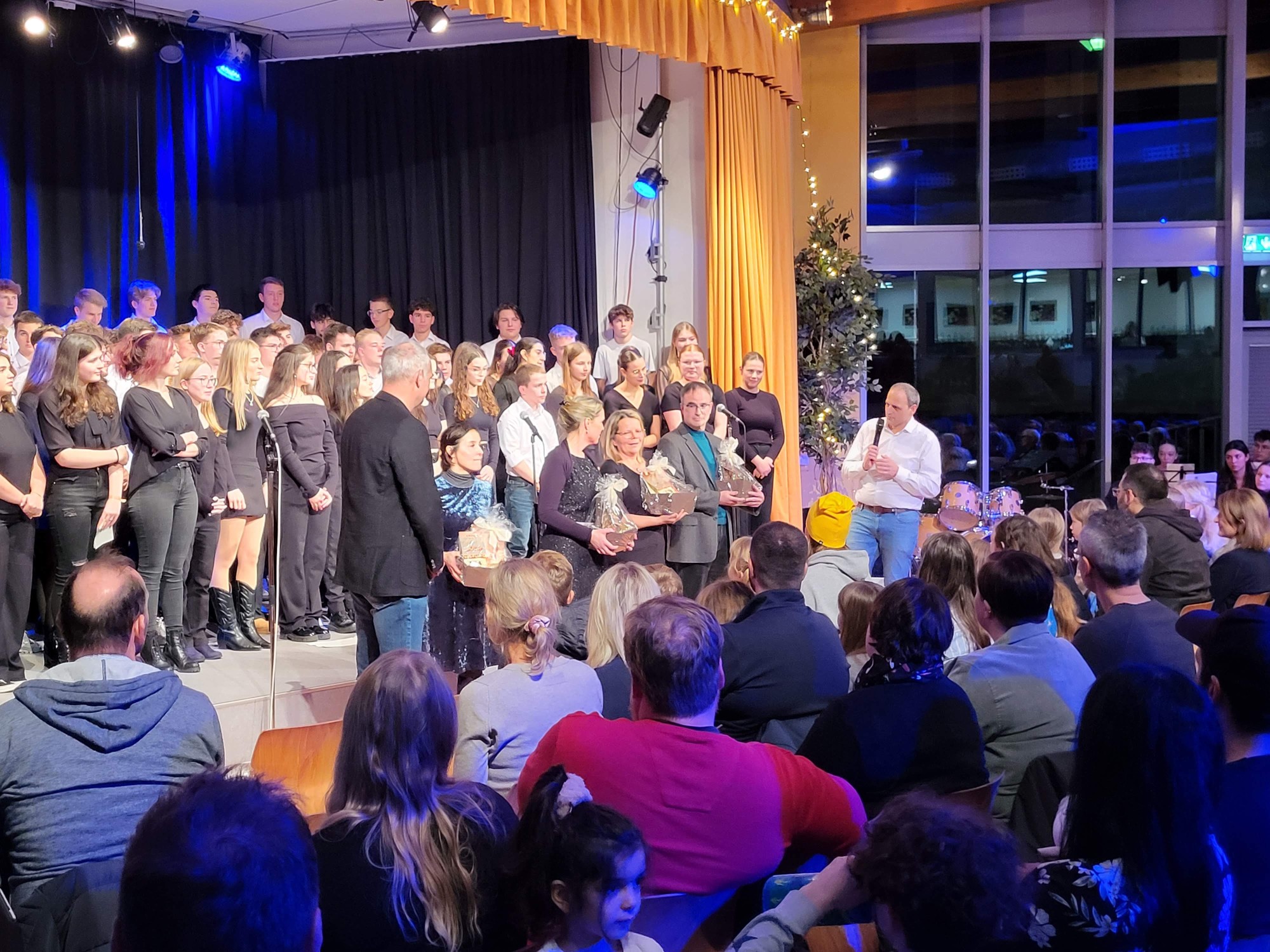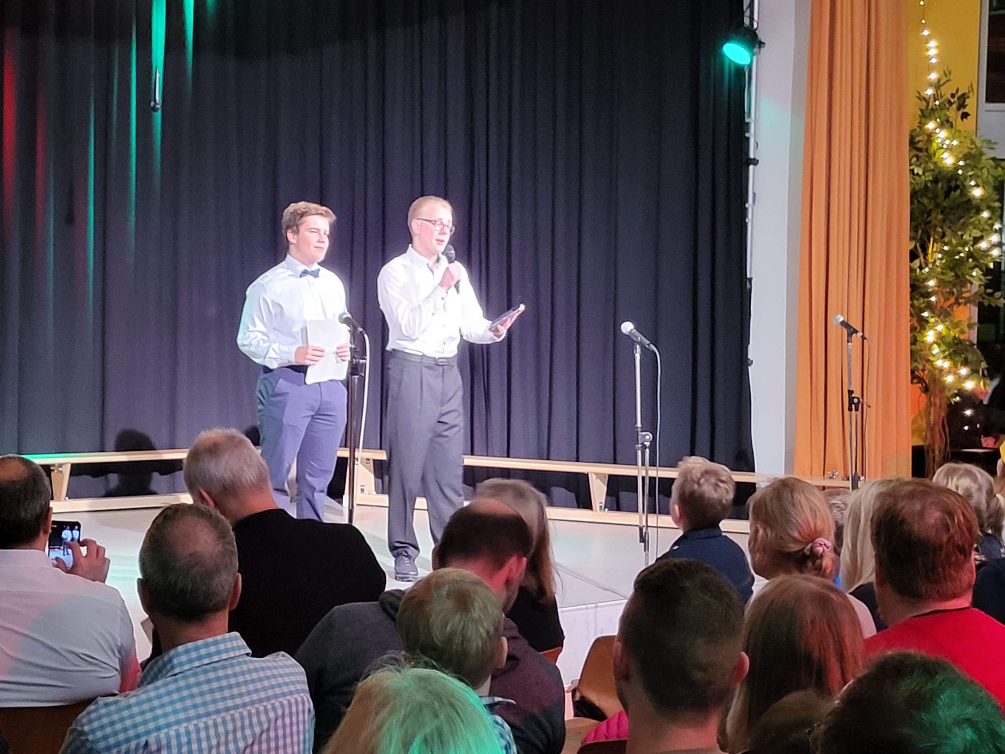 Als vorletzten Programmpunkt präsentierte sich die Klasse 10e, unter Leitung von Frau Fayzi, und trug verschiedene Weihnachtslieder toll vor. Den Abschluss des Programmes bildete der Oberstufenchor, der sich nun mit drei weihnachtlichen Stücken präsentierte, u.a. mit dem Klassiker „Last christmas“. Mit einem zweistimmigen „Silent night“ endete der offizielle Teil des Konzertes und das traditionelle Lied „O du Fröhliche“ wurde zum Abschluss mit allen, begleitet von der Big Band, gesungen. Passend zu dem tollen Programm moderierten Linus Heinemann und Maxim Chetchouga (beide MSS 13) lebhaft und unterhaltsam durch den Abend. Es war ein rundum schönes Konzerterlebnis, das mit den Dankesworten des Schulleiters an die ausführenden Schülerinnen und Schüler und die Musiklehrer/innen herzlich beendet wurde.