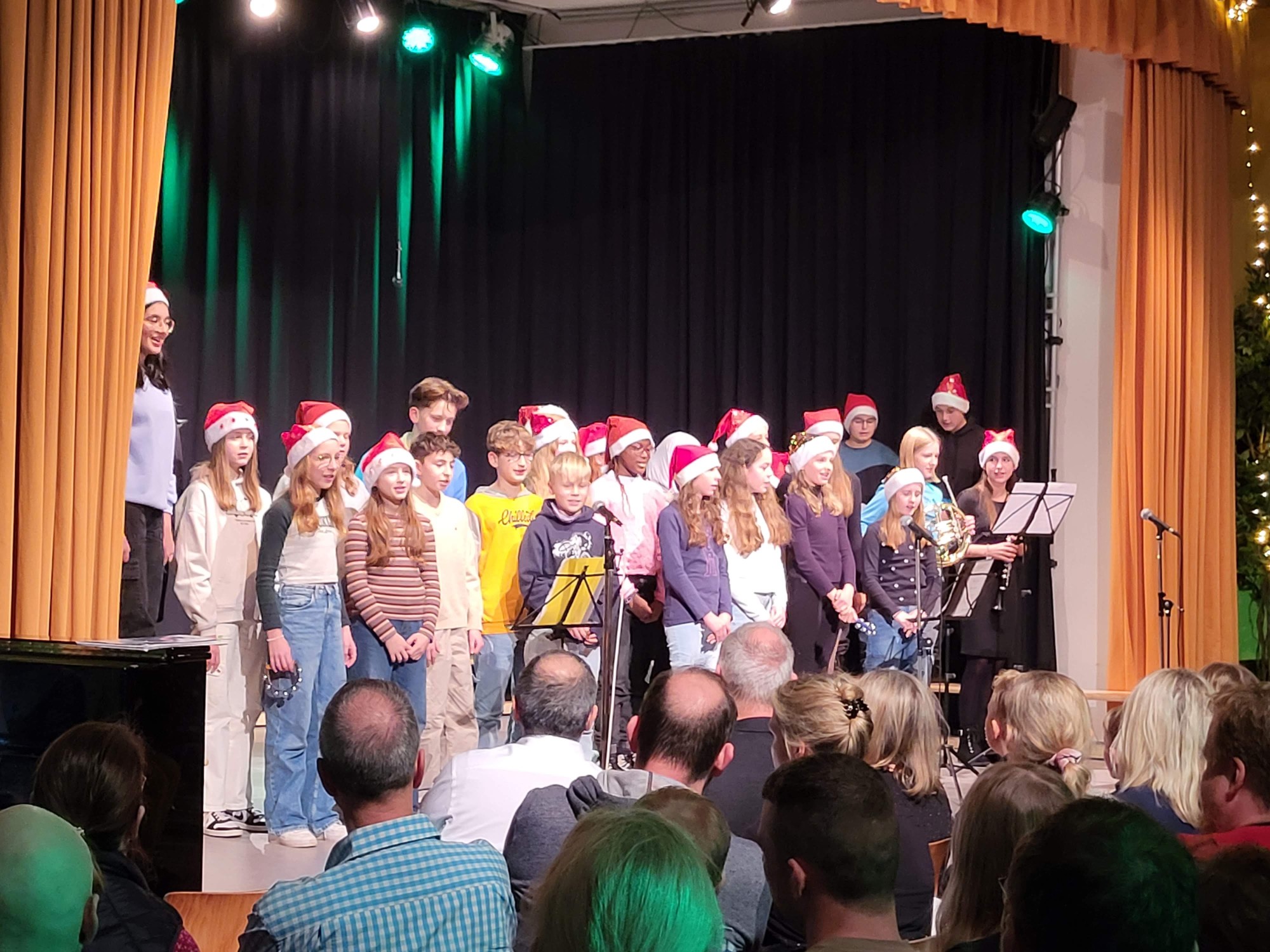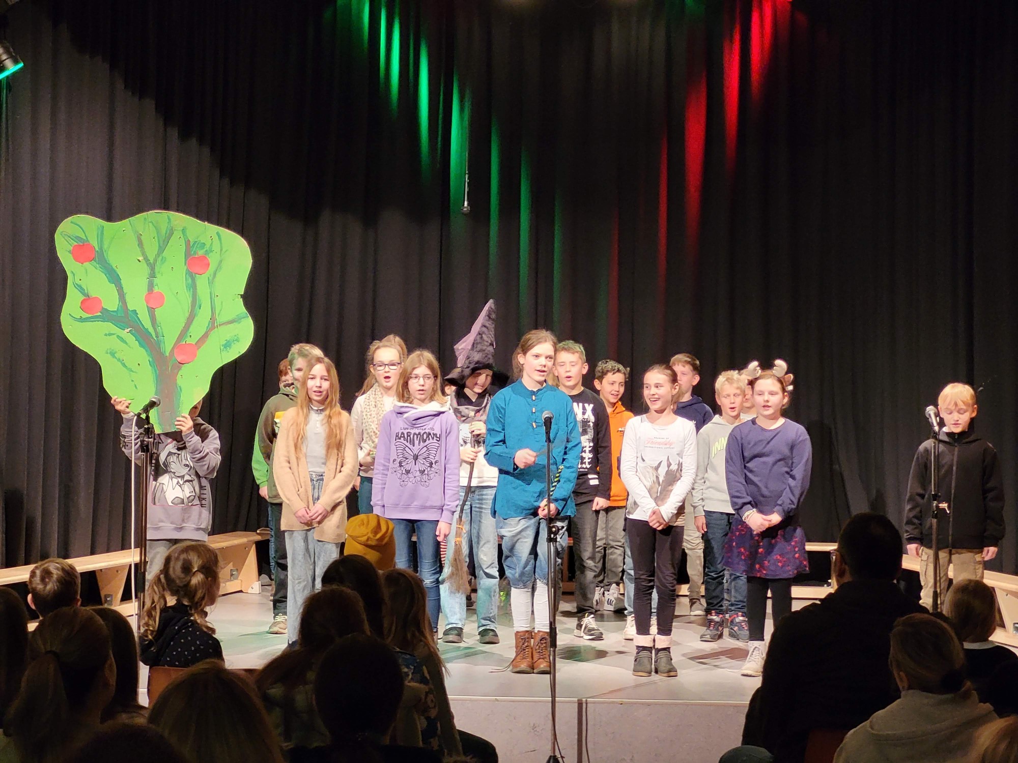 Es folgte die Klasse 7f mit zwei Weihnachtsliedern, die am Klavier von Frau Sofya Fayzi begleitet und prima präsentiert wurden. Mit dem Lied „Die alte Moorhexe“ präsentierte sich die Klasse 5g, die zur lebhaften szenischen Darstellung des Liedinhaltes auch die nötigen Requisiten dabei hatte (Einstudierung: Karin Dethof).