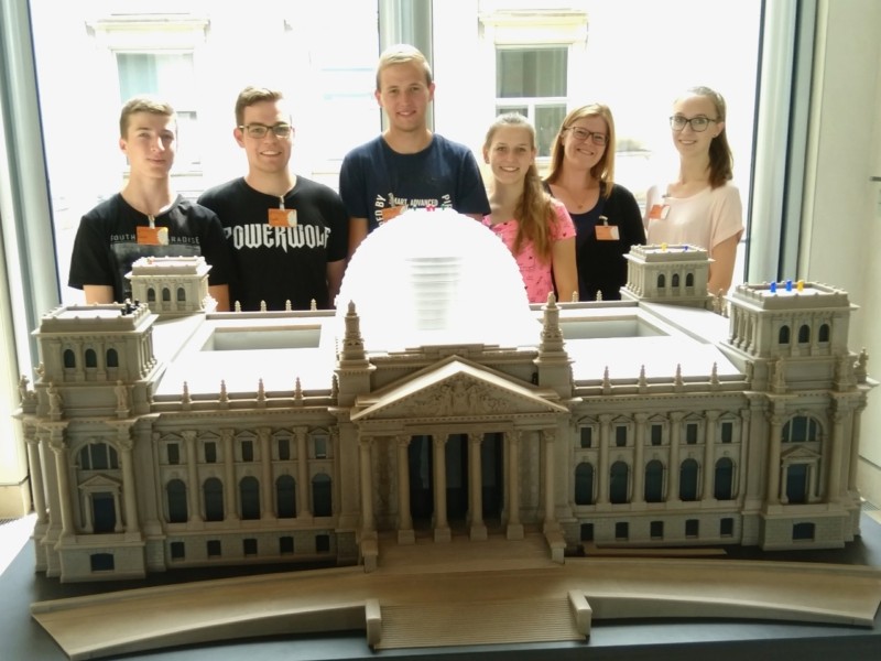 Den zweiten Tag starteten die Schüler mit einer kurzweiligen Führung durch den Bundestag - wobei auf dem Weg dort hin ein Foto vor dem Brandenburger Tor nicht fehlen durfte. Dank Kevin Francke, wissenschaftlicher Mitarbeiter der MdB Gabi Weber aus dem Wahlkreis Montabaur, konnten z. B. Räume der Bundestagsfraktion besichtigt werden.