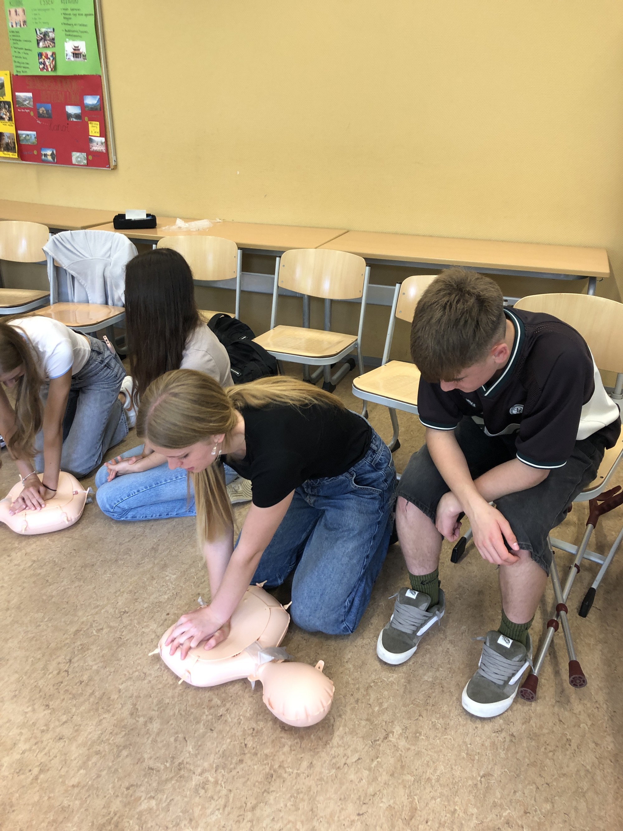 Anfängliche Berührungsängste mit dem Thema und den Reanimationspuppen waren schnell verflogen und die Schülerinnen und Schüler waren eifrig bei der Sache. Fleißig übten sie an Übungspuppen Herzdruckmassage zum Rhythmus von „Highway to hell“ und “Staying alive“ und trainierten später auch die Durchführung der Mund-zu-Mund-Beatmung.