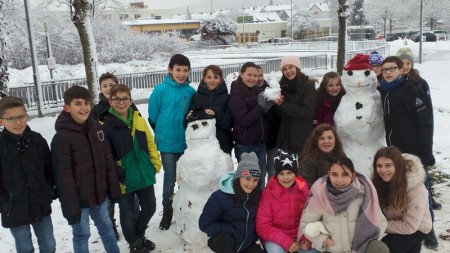 Nachdem am Montagmorgen aufgrund des erneuten Wintereinbruchs viele Klassen am MTG nur halb gefüllt waren, zögerten einige Lehrkräfte nicht lange und änderten kurzerhand ihr geplantes Unterrichtprogramm. So ging die 5a mit Klassenlehrerin Monika Joras nach draußen und baute Schneemänner. Die Bewegung an der frischen Luft tat allen sehr gut und hat den Kindern sichtlich Spaß gemacht. Die Schneemänner werden vermutlich die Wochenmitte nicht mehr erleben, daher wurde die Aktion fürs Fotoalbum festgehalten.