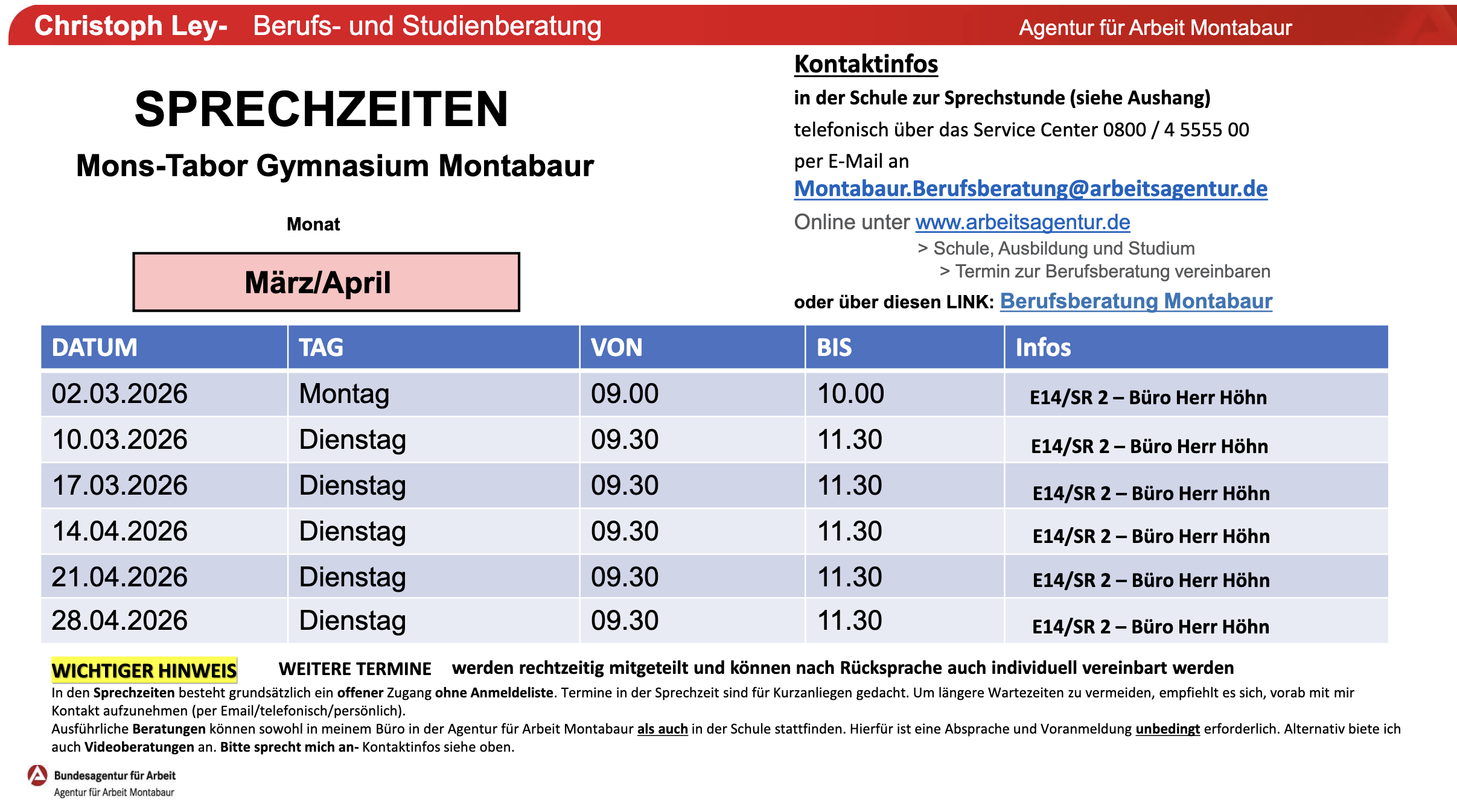 Das landesweite Angebot an Veranstaltungen (für Schülerinnen und Schüler, Eltern und Lehrkräfte) rund um Berufs- und Studienorientierung (BSO) kann im Online-Kalender des Bildungsservers recherchiert werden. Besonders komfortabel: Direkte Suche im Umkreis von 50km zu Montabaur.